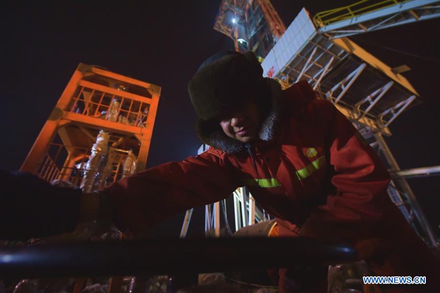 URUMQI, 20 décembre (Xinhua) -- Un ouvrier travaille sur le chantier d'un puits de gaz dans la région autonome ouïgoure du Xinjiang, dans le nord-ouest de la Chine, le 19 décembre 2020. Un énorme gisement de gaz avec des réserves estimées à plus de 100 milliards de mètres cubes a été découvert dans la région autonome ouïgoure du Xinjiang, selon le bureau local de PetroChina. (Photo : Zhou Jianling)