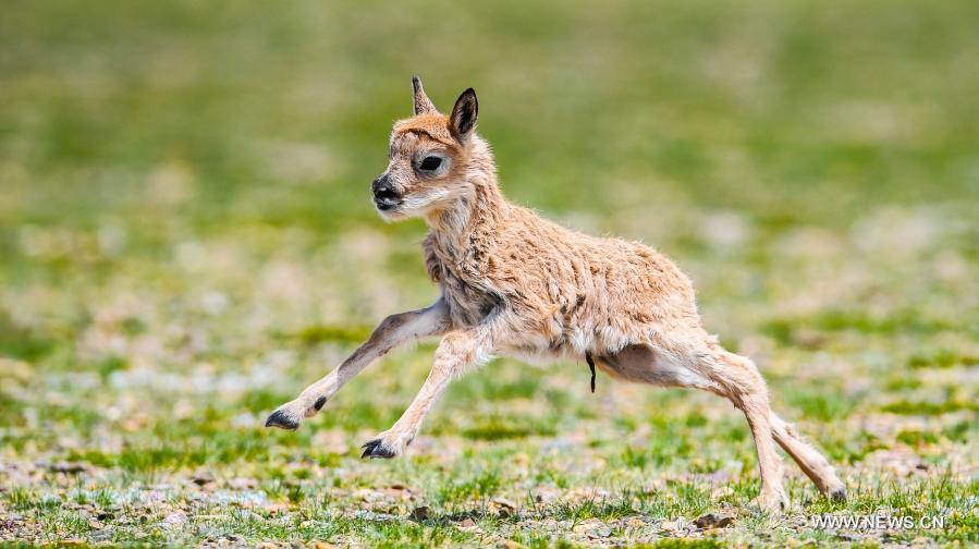 La photo d'archives prise le 24 juin 2017 montre une bébé antilope tibétaine dans le district de Xainza de la région autonome du Tibet (sud-ouest de la Chine). Grâce à des efforts inlassables, la population d'antilopes tibétaines au Tibet est passée d'environ 50 000 dans les années 1990 à plus de 200 000 aujourd'hui. L'espèce a été ramenée du bord de l'extinction. (Xinhua/Purbu Zhaxi)