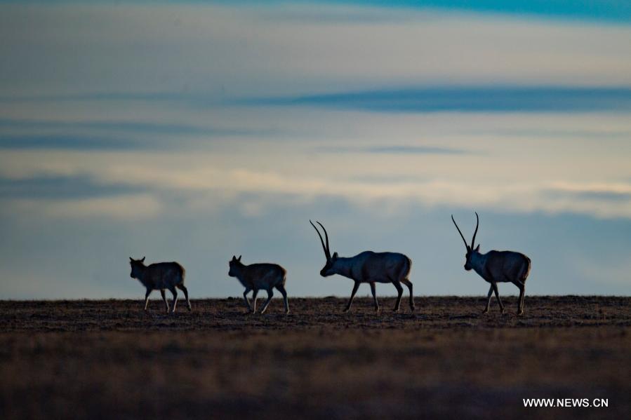Photo prise le 31 janvier 2019 montrant des antilopes tibétaines dans le district de Shuanghu, dans la région autonome du Tibet (sud-ouest de la Chine). Grâce à des efforts inlassables, la population d'antilopes tibétaines au Tibet est passée d'environ 50 000 dans les années 1990 à plus de 200 000 aujourd'hui. L'espèce a été ramenée du bord de l'extinction. (Xinhua/Sun Fei)