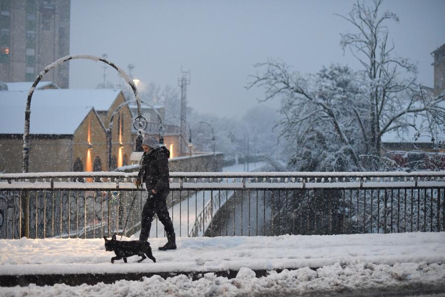 Une femme promène son chien sous la neige à Milan, en Italie, le 28 décembre 2020. (Xinhua/Daniele Mascolo)