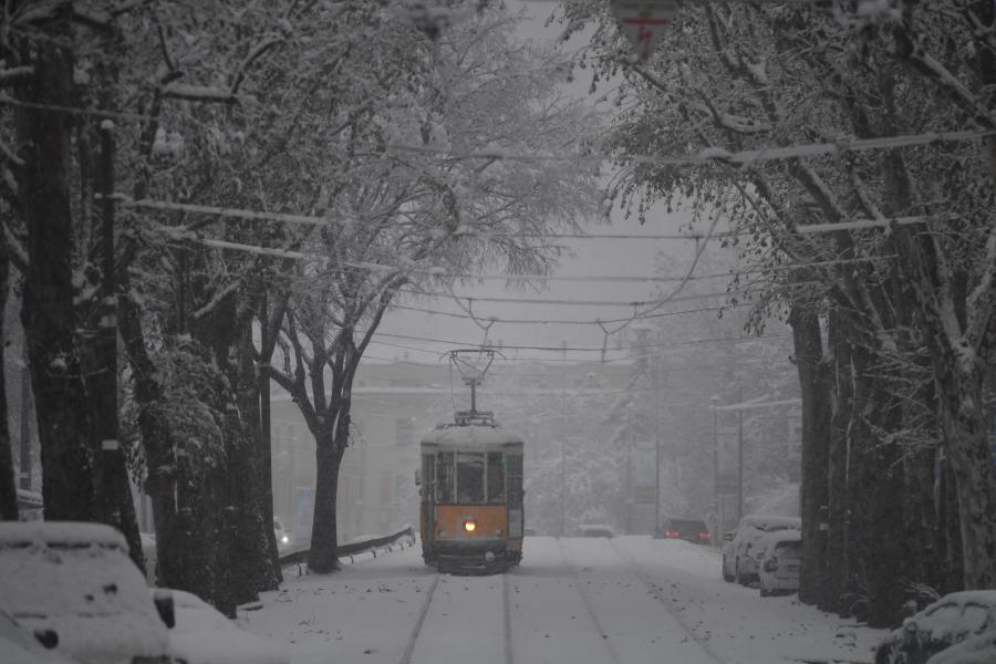 Photo prise le 28 décembre 2020 montrant un tram sous la neige à Milan, en Italie, le 28 décembre 2020. (Xinhua/Daniele Mascolo)