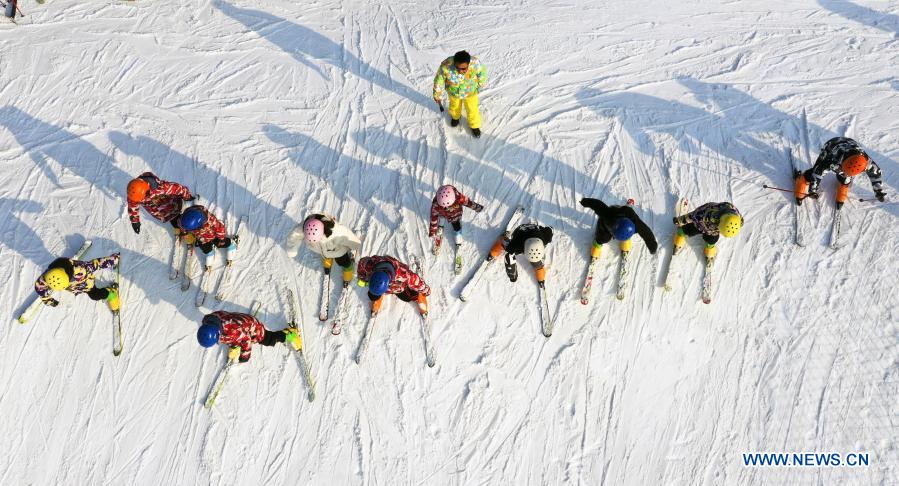 TANGSHAN, 3 janvier (Xinhua) -- Photo aérienne de gens faisant du ski dans une station de sports d'hiver, pendant les vacances du Nouvel An, à Zunhua, de la ville de Tangshan, dans la province chinoise du Hebei (nord), le 2 janvier 2021. (Photo : Liu Mancang)