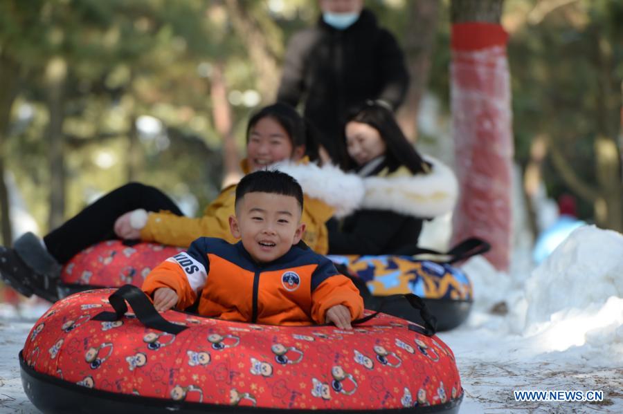 WEIHAI, 3 janvier (Xinhua) -- Des enfants font de la bouée sur neige pendant les vacances du Nouvel An, à Rongcheng, dans la province chinoise du Shandong (est), le 2 janvier 2021. (Photo : Yang Zhili)