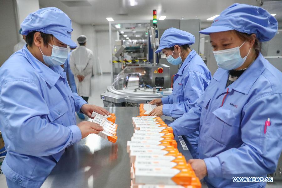 BEIJING, 7 janvier (Xinhua) -- Des employés travaillent dans une usine d'emballage de vaccins contre le COVID-19 de la société Sinovac Research and Development Co., Ltd., à Beijing, capitale chinoise, le 6 janvier 2021. L'inoculation du vaccin contre le COVID-19 parmi les groupes spécifiques de personnes présentant un risque d'infection plus élevé a récemment démarré dans toute la Chine. Les producteurs de vaccins, dont Sinovac Research and Development Co., Ltd., s'emploient à produire des vaccins contre le COVID-19 afin d'assurer une inoculation ordonnée. (Photo : Zhang Yuwei)