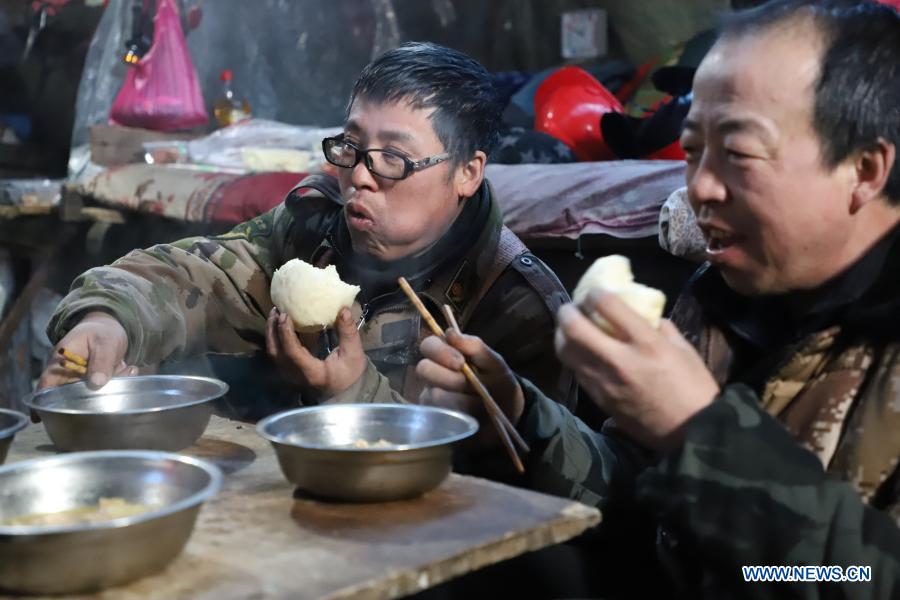 DAHINGGAN, 10 janvier (Xinhua) -- Des ouvriers forestiers prennent leur repas dans une tente temporaire dans l'arrondissement de Huzhong à Dahinggan, dans la province chinoise du Heilongjiang (nord-est), le 9 janvier 2021. Pendant l'hiver glacial, de nombreux ouvriers forestiers restent fidèles à leur poste de gestion et de production forestières, coupant le bois malade et pourri et entretenant la forêt. Onze ouvriers forestiers de la réserve de Daxigou, sous l'autorité du bureau des forêts de l'arrondissement de Huzhong, sont arrivés sur le site d'exploitation le 2 janvier, effectuant des travaux de nettoyage de la forêt. Ils vivront sous des tentes temporaires pendant près de 20 jours sans réseau téléphonique. (Photo : Wang Jianwei)