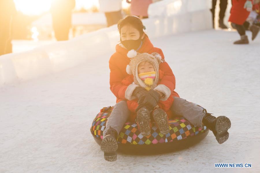 Des touristes s'amusent dans un parc de glace et de neige à Mohe, dans la province chinoise du Heilongjiang (nord-est de la Chine), le 8 janvier 2021. (Xinhua/Xie Jianfei)
