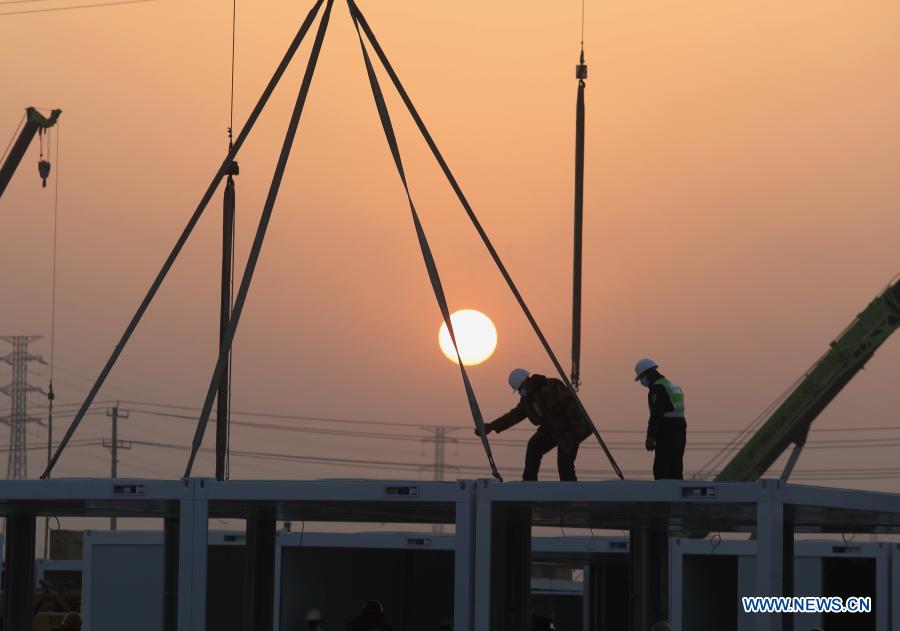 SHIJIAZHUANG, 17 janvier (Xinhua) -- Des ouvriers travaillent sur le site de construction d'un centre d'isolement à Shijiazhuang, capitale de la province chinoise du Hebei (nord), le 16 janvier 2021. Dans le cadre des mesures pour faire face à la récente résurgence du COVID-19, les autorités de Shijiazhuang se sont empressées pour construire un nouveau centre d'isolement d'une capacité conçue de 3.000 pièces dans le district de Zhengding. Les contacts étroits et les contacts à proximité des patients confirmés du COVID-19 seront placés en observation médicale dans ce nouveau centre, qui couvrira une superficie totale d'environ 33,3 hectares, selon le bureau du logement et du développement urbain et rural de Shijiazhuang. D'une superficie de 18 mètres carrés, chaque pièce sera équipée d'installations telles que la climatisation et des chauffe-eau. (Photo : Yang Shiyao)