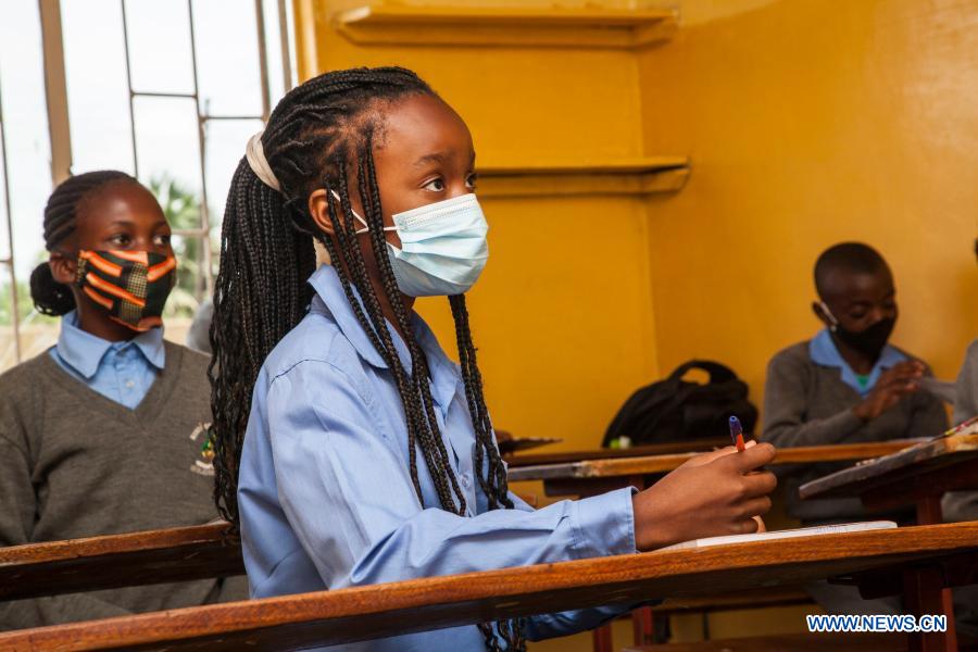 LUSAKA, 2 février (Xinhua) -- Des élèves portant des masques dans une école privée de Lusaka, en Zambie, le 1er févier 2021. Le président zambien, Edgar Lungu, a appelé lundi au respect strict des mesures de prévention contre le COVID-19, alors que les écoles ont rouvert dans le pays. (Photo : Martin Mbangweta)