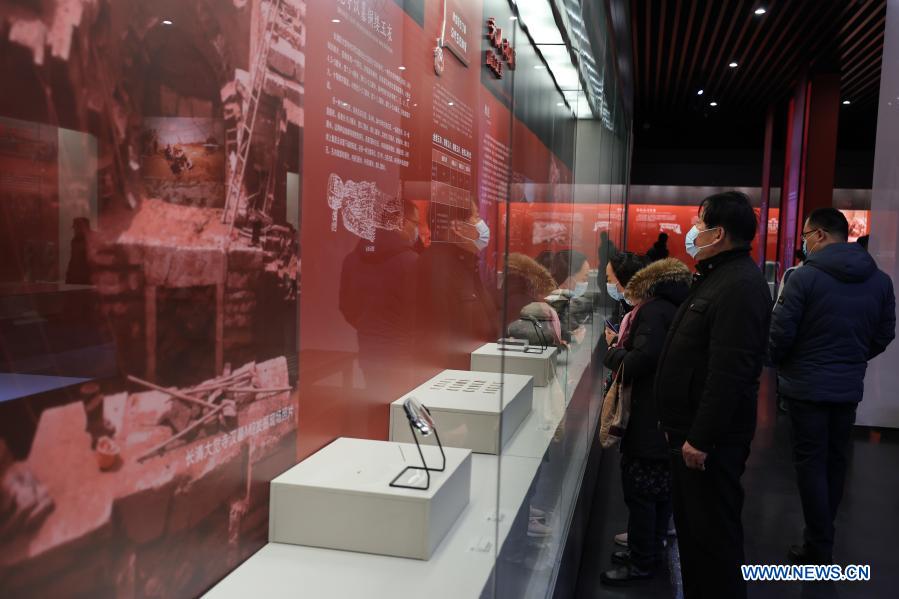 JINAN, 17 février (Xinhua) -- Des visiteurs admirent une exposition de reliques culturelles de la dynastie Han (206 av. J.-C. - 220 apr. J.-C.) à Jinan, dans la province chinoise du Shandong (est), le 16 février 2021. (Photo : Zhu Zheng)