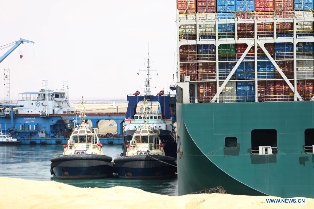 LE CAIRE, 27 mars (Xinhua) -- Des navires de secours sur le site où un porte-conteneur s'est échoué dans le canal de Suez, en Egypte, le 26 mars 2021. Un navire géant bloque le canal le plus fréquenté du monde depuis mardi, et l'Autorité du canal de Suez a réaffirmé que le trafic maritime dans le canal serait rétabli le plus vite possible. (Photo : Ahmed Gomaa)