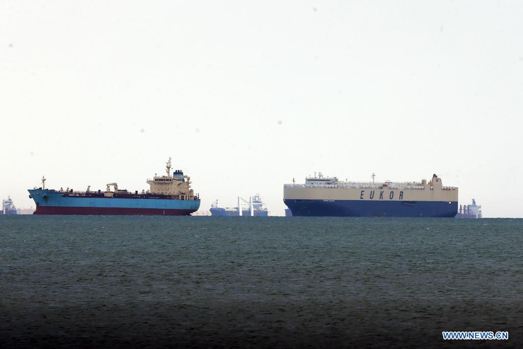 LE CAIRE, 27 mars (Xinhua) -- Des navires dans le golfe de Suez attendent de traverser le canal de Suez bloqué par un porte-conteneur échoué, en Egypte, le 26 mars 2021. Un navire géant bloque le canal le plus fréquenté du monde depuis mardi, et l'Autorité du canal de Suez a réaffirmé que le trafic maritime dans le canal serait rétabli le plus vite possible. (Photo : Ahmed Gomaa)