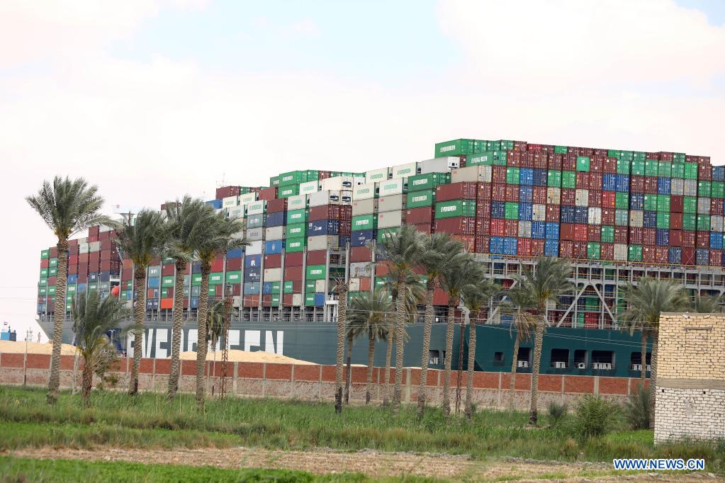 LE CAIRE, 27 mars (Xinhua) -- Un porte-conteneur coincé dans le canal de Suez, en Egypte, le 26 mars 2021. Un navire géant bloque le canal le plus fréquenté du monde depuis mardi, et l'Autorité du canal de Suez a réaffirmé que le trafic maritime dans le canal serait rétabli le plus vite possible. (Photo : Ahmed Gomaa)