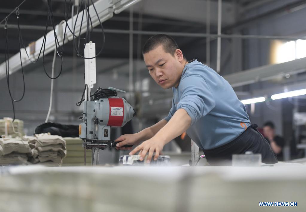 SHIJIAZHUANG, 29 mars (Xinhua) -- Un employé travaille dans une usine de vêtements dans l'arrondissement de Nanhe, à Xingtai, ville de la province chinoise du Hebei (nord), le 28 mars 2021. Le gouvernement local a pris des mesures pour construire diverses plateformes dans le but d'offrir des opportunités d'emploi aux villageois locaux. (Photo : Zhu Xudong)