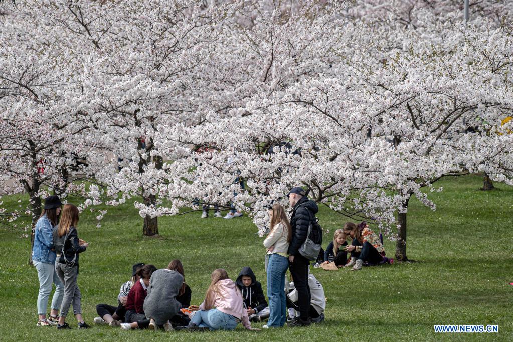 Des gens admirent des cerisiers en fleurs dans un parc de Vilnius, en Lituanie, le 1er mai 2021. (Xinhua/Alfredas Pliadis)