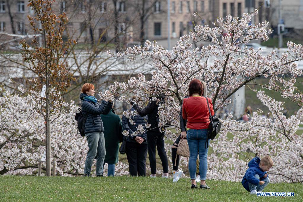 Des gens admirent des cerisiers en fleurs dans un parc de Vilnius, en Lituanie, le 1er mai 2021. (Xinhua/Alfredas Pliadis)