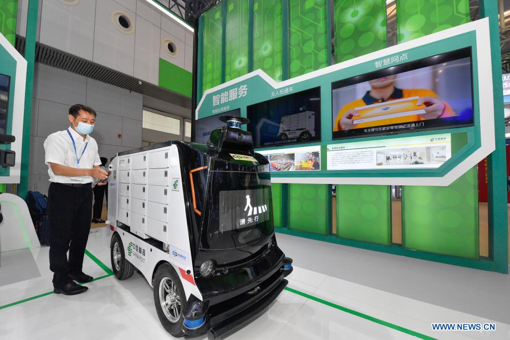 TIANJIN, 21 mai (Xinhua) -- Un membre du personnel présente un véhicule de livraison autonome lors du Congrès mondial de l'intelligence, à Tianjin, dans le nord de la Chine, le 20 mai 2021. Le cinquième Congrès mondial de l'intelligence, un événement majeur de l'intelligence artificielle (IA) en Chine, a débuté jeudi, mettant en lumière les technologies et les applications de pointe de l'IA. (Photo : Sun Fanyue)