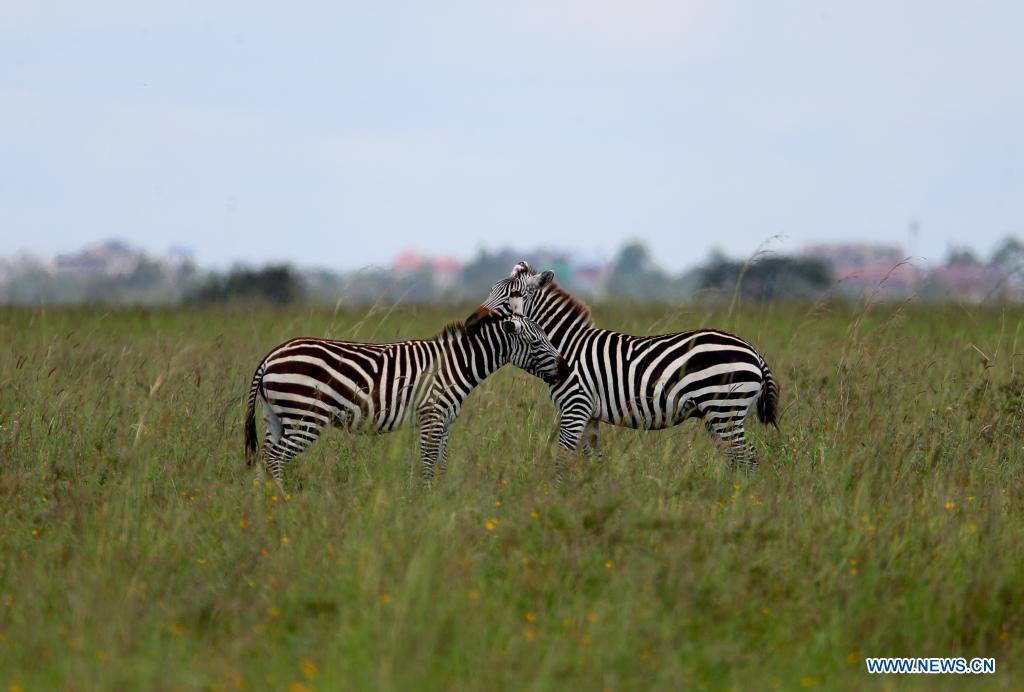 Photo prise le 19 mai 2021 montrant deux zèbres dans le Parc national de Nairobi, à Nairobi, au Kenya. La Journée internationale de la biodiversité tombe le 22 mai. (Xinhua/Long Lei)