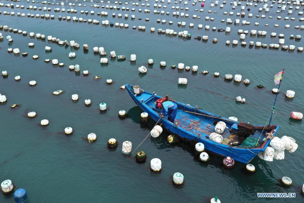 ZHOUSHAN, 31 mai (Xinhua) -- Photo aérienne d'une base d'élevage de moules dans le district de Shensi, à Zhoushan, dans la province chinoise du Zhejiang (est), le 29 mai 2021. (Photo : Yao Feng)