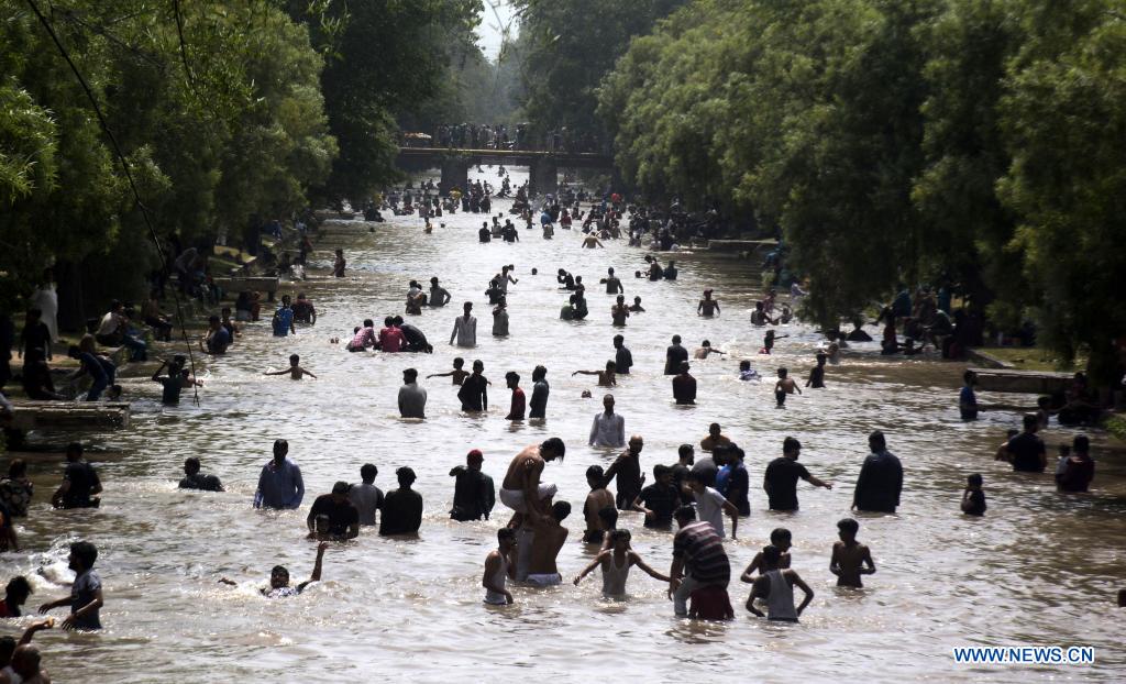 LAHORE (PAKISTAN), 31 mai (Xinhua) -- Des gens se rafraîchissent dans un canal à Lahore, capitale de la province du Pendjab du Pakistan, le 30 mai 2021. La température a atteint 38 degrés Celsius dimanche à Lahore, selon le département météorologique du Pakistan. (Photo : Sajjad)