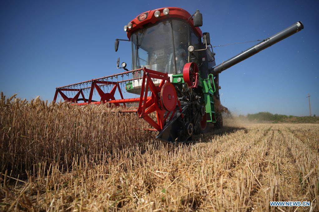Une moissonneuse récolte le blé dans un champ à Xingtai, dans la province du Hebei (nord de la Chine), le 6 juin 2021. (Xinhua/Luo Xuefeng)