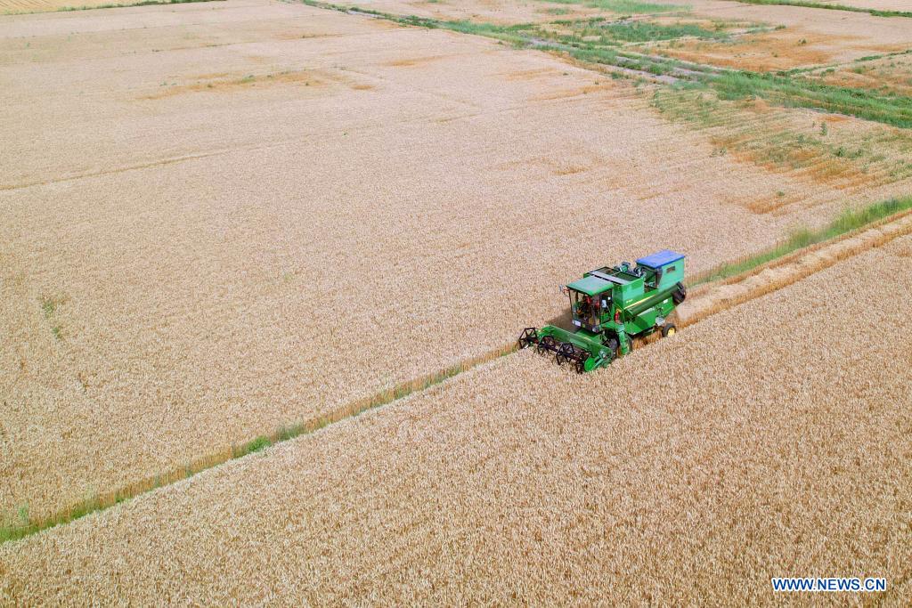 Photo prise le 29 juillet 2021 montrant la récolte du blé à Bayannur, dans la région autonome de Mongolie intérieure (nord de la Chine). (Xinhua/Li Yunping)