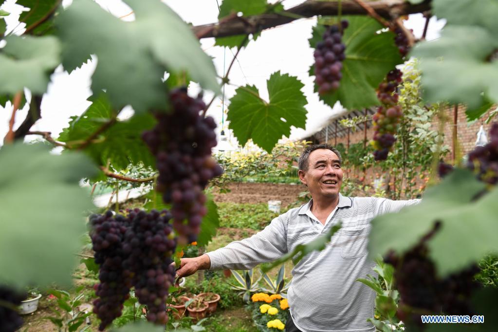 YUSHU, Qinghai, 10 août (Xinhua) -- Wei Jinming dans sa plantation de légumes dans le village de Xinzhai, du bourg de Jiegu, dans la préfecture autonome tibétaine de Yushu, dans la province chinoise du Qinghai (nord-ouest), le 5 août 2021. M. Wei, originaire du Henan (centre de la Chine), a déménagé à Jiegu pour commencer sa plantation sur une parcelle de terre agricole sous contrat. Après des années de travail laborieux, il cultive actuellement plus de 30 sortes de légumes et de fruits dans une serre de 300 m². Sa serre fait partie des nombreuses serres en plein développement à Yushu. Cette année marque le 70e anniversaire de l'établissement de la préfecture autonome tibétaine de Yushu. (Photo : Wu Gang)