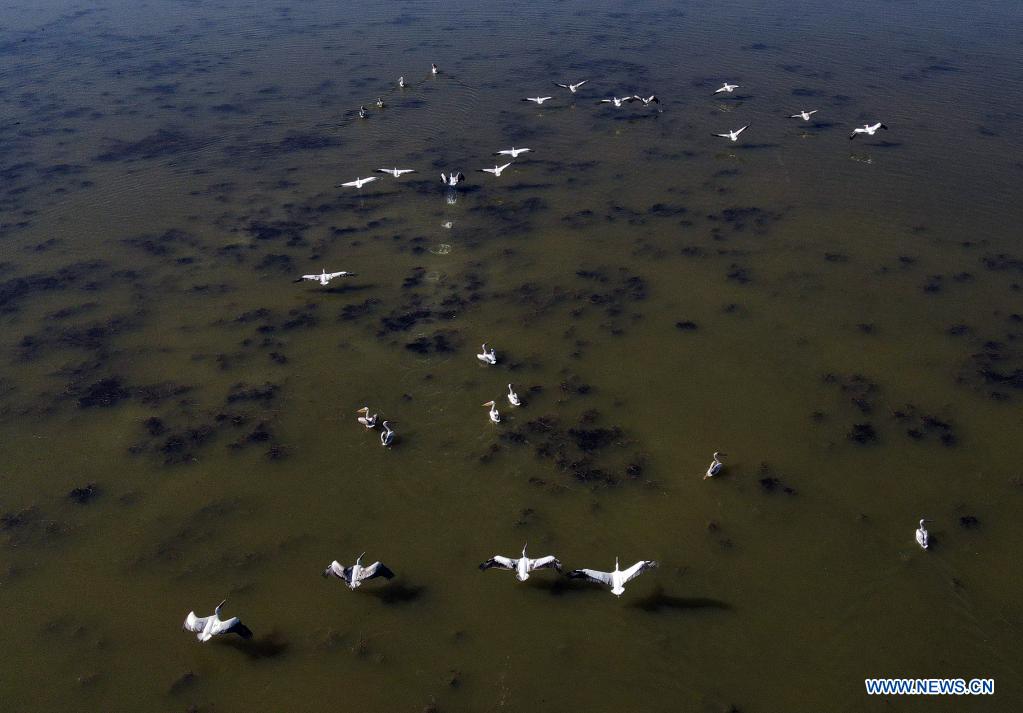 Photo prise le 11 août 2021 montrant des pélicans au lac Mogan à Ankara, en Turquie. (Xinhua/Mustafa Kaya)