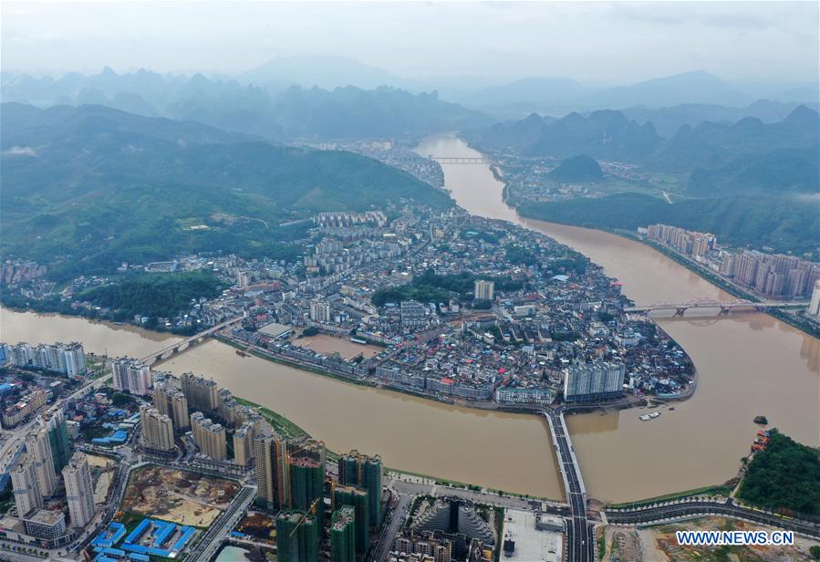 GUILIN, 12 juin (Xinhua) -- Photo aérienne d'une rivière dans le district de Pingle, dans la région autonome Zhuang du Guangxi (sud), le 11 juin 2020. La Chine a alloué un lot de matériels de secours en cas de catastrophe à la région, où plus de 1,45 millions d'habitants ont été affectés par les inondations engendrées par de fortes pluies depuis le 1er juin. (Photo : Lu Boan)