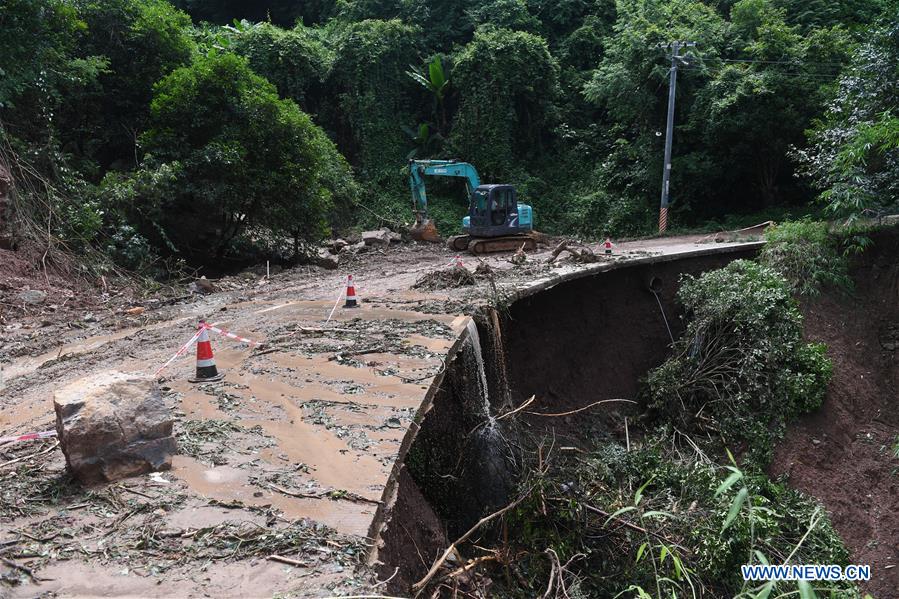 GUILIN, 12 juin (Xinhua) -- Une rue détruite par le glissement de terrain dans le bourg de Puyi du district de Yangshuo, dans la région autonome Zhuang du Guangxi (sud), le 11 juin 2020. La Chine a alloué un lot de matériels de secours en cas de catastrophe à la région, où plus de 1,45 millions d'habitants ont été affectés par les inondations engendrées par de fortes pluies depuis le 1er juin. (Photo : Lu Boan)
