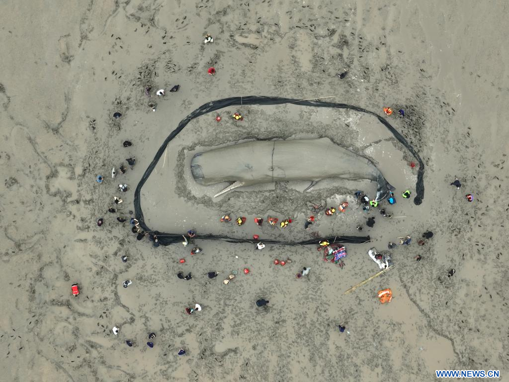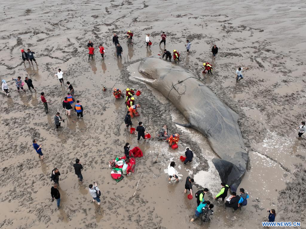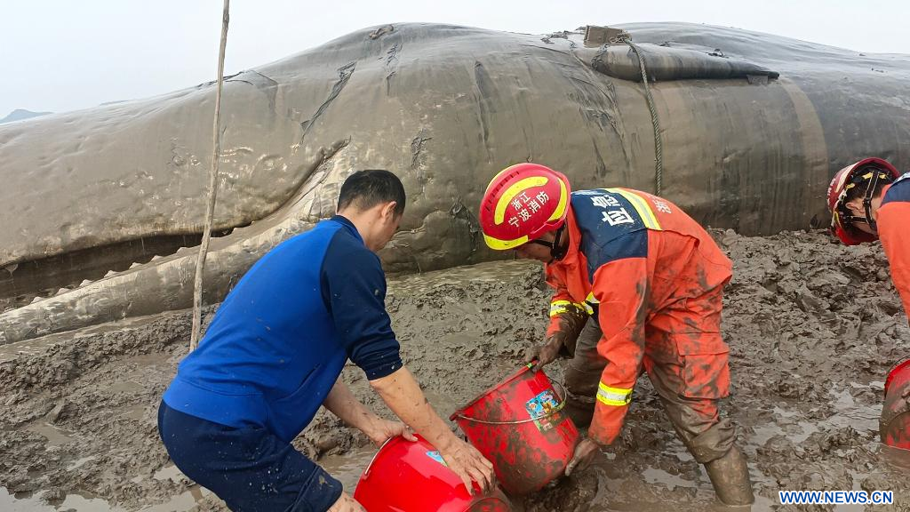 La baleine s'était échouée mardi matin près du district de Xiangshan, dans la ville de Ningbo. L'administration locale de la pêche et le personnel chargé de la lutte contre les incendies ont immédiatement mené l'opération de sauvetage.