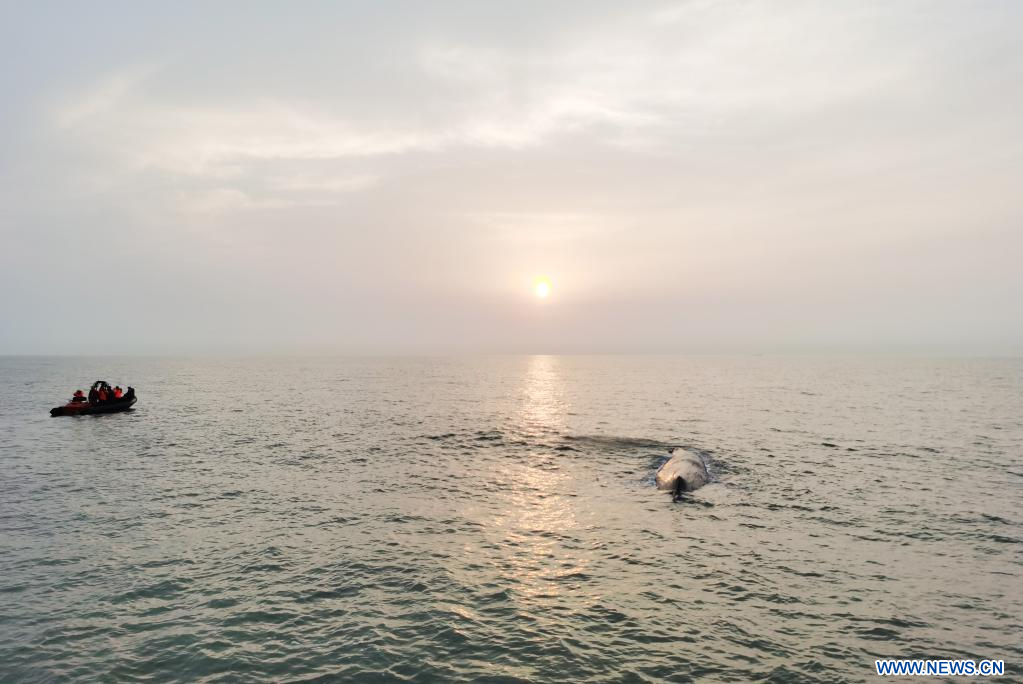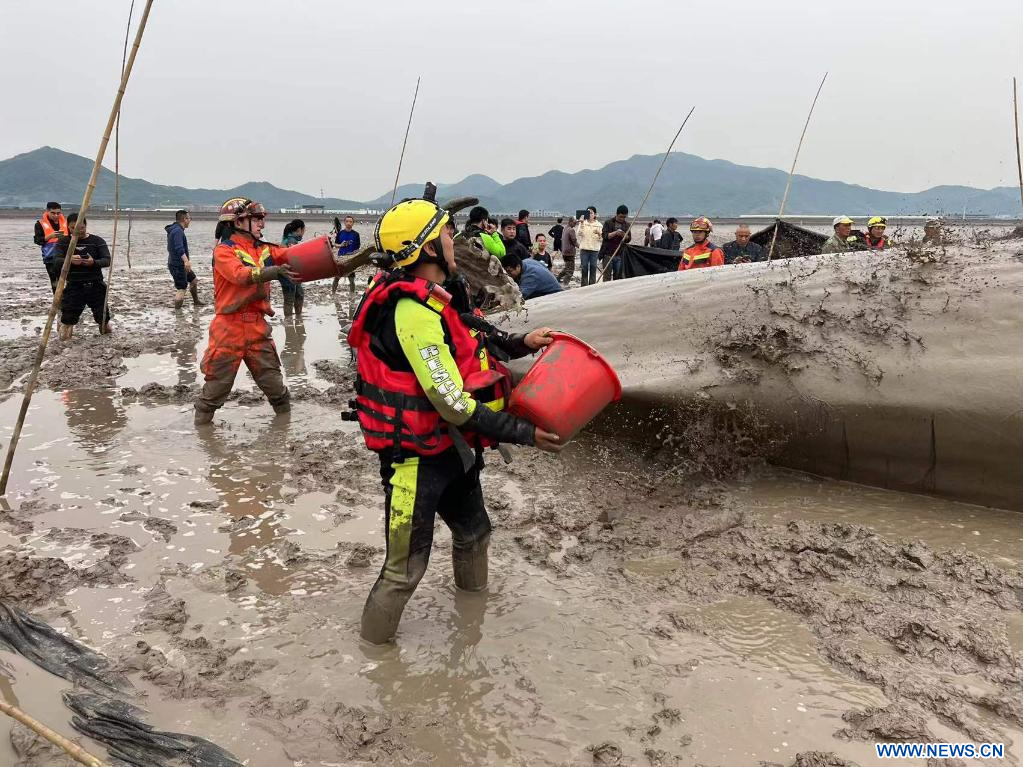 HANGZHOU, 20 avril (Xinhua) -- Les sauveteurs ont évacué une baleine échouée vers des eaux profondes dans la province chinoise du Zhejiang (est), après 20 heures d'opération de sauvetage.