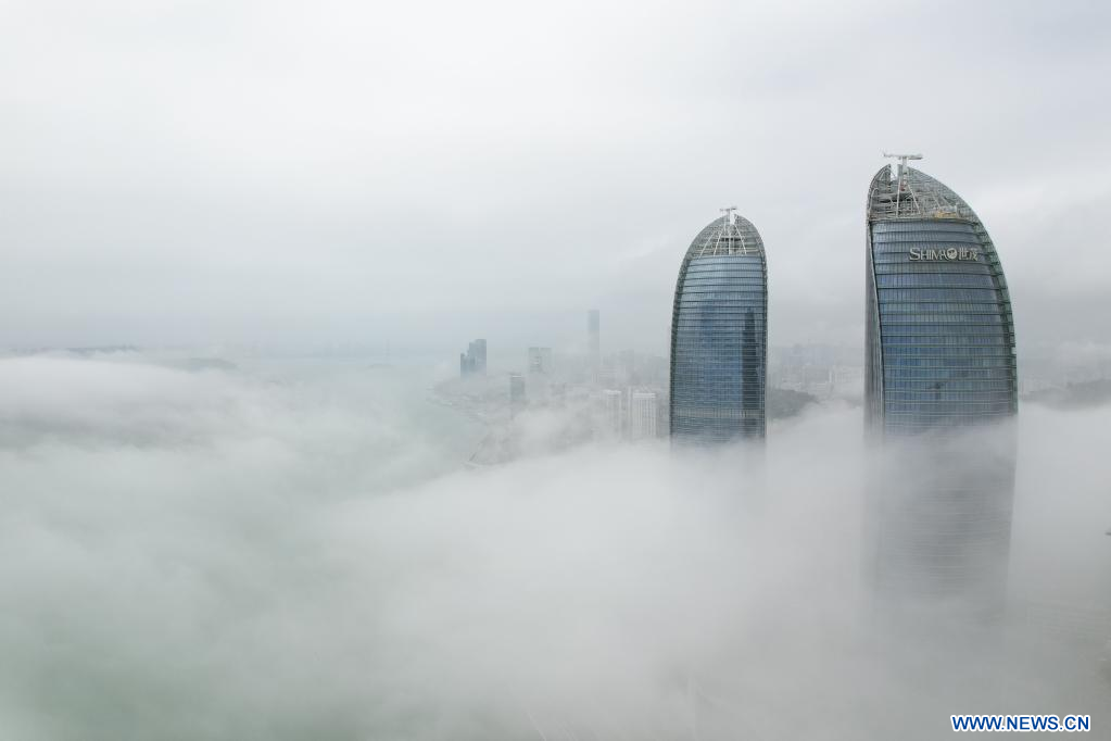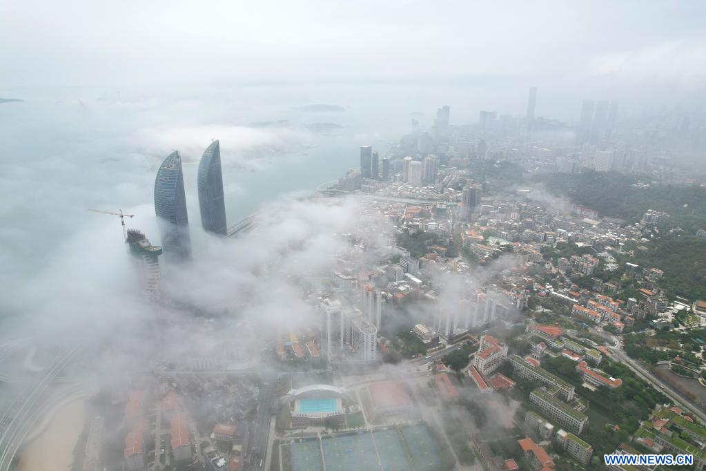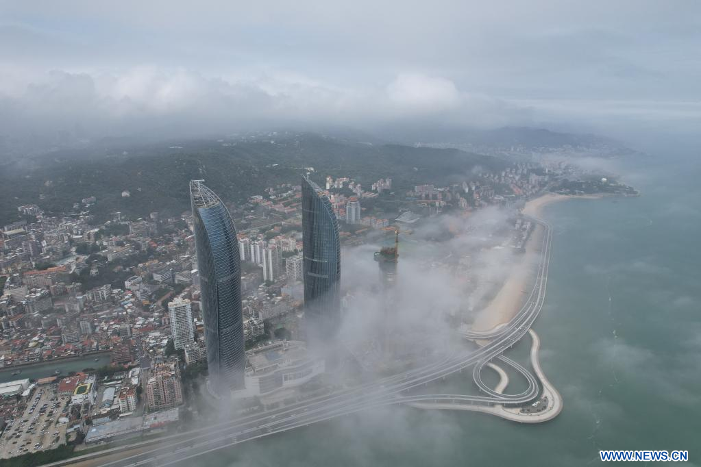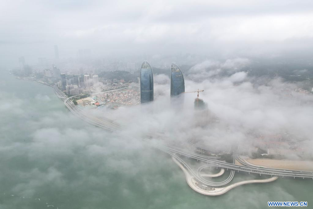 XIAMEN, 27 mai (Xinhua) -- Paysage du brouillard d'advection à Xiamen, dans la province chinoise du Fujian (sud-est), le 26 mai 2022. (Photo : Zeng Demeng)