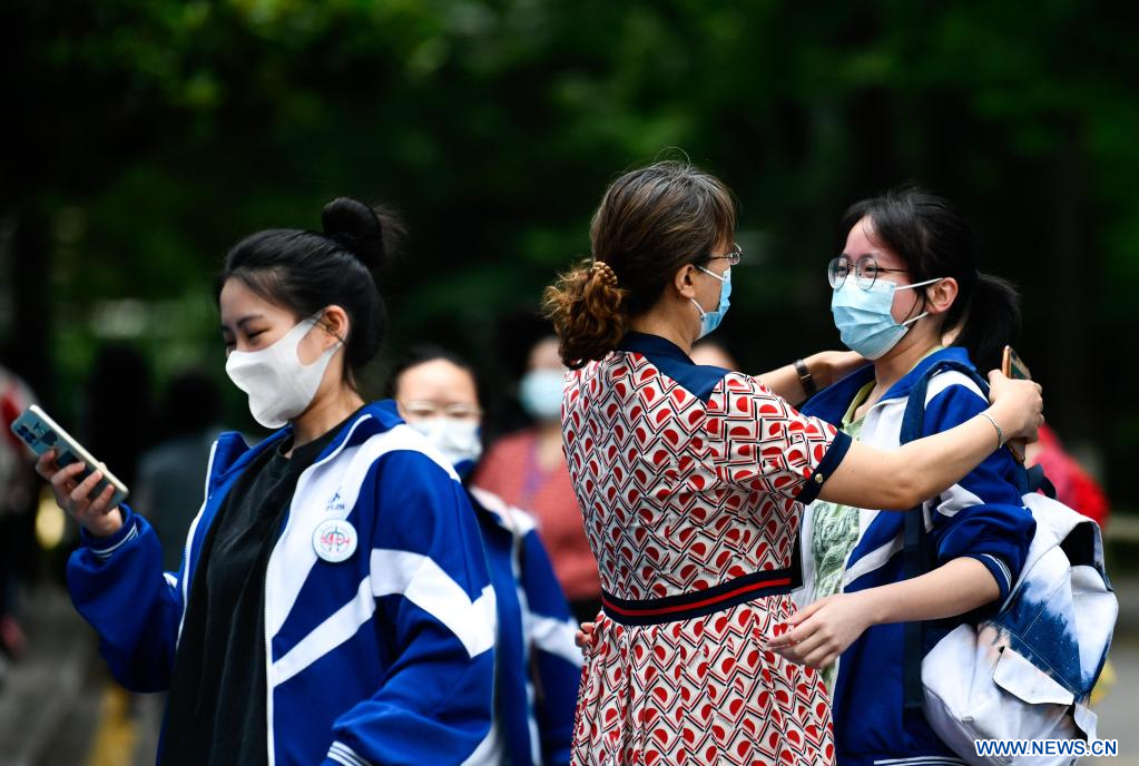 GUIYANG, 7 juin (Xinhua) -- Une professeure encourage son élève sur un site de concours à Guiyang, dans la province du Guizhou (sud-ouest), le 7 juin 2022. Le concours national d'entrée à l'université de la Chine, aussi connu sous le nom de Gaokao, a commencé mardi cette année. (Photo : Yang Wenbin)