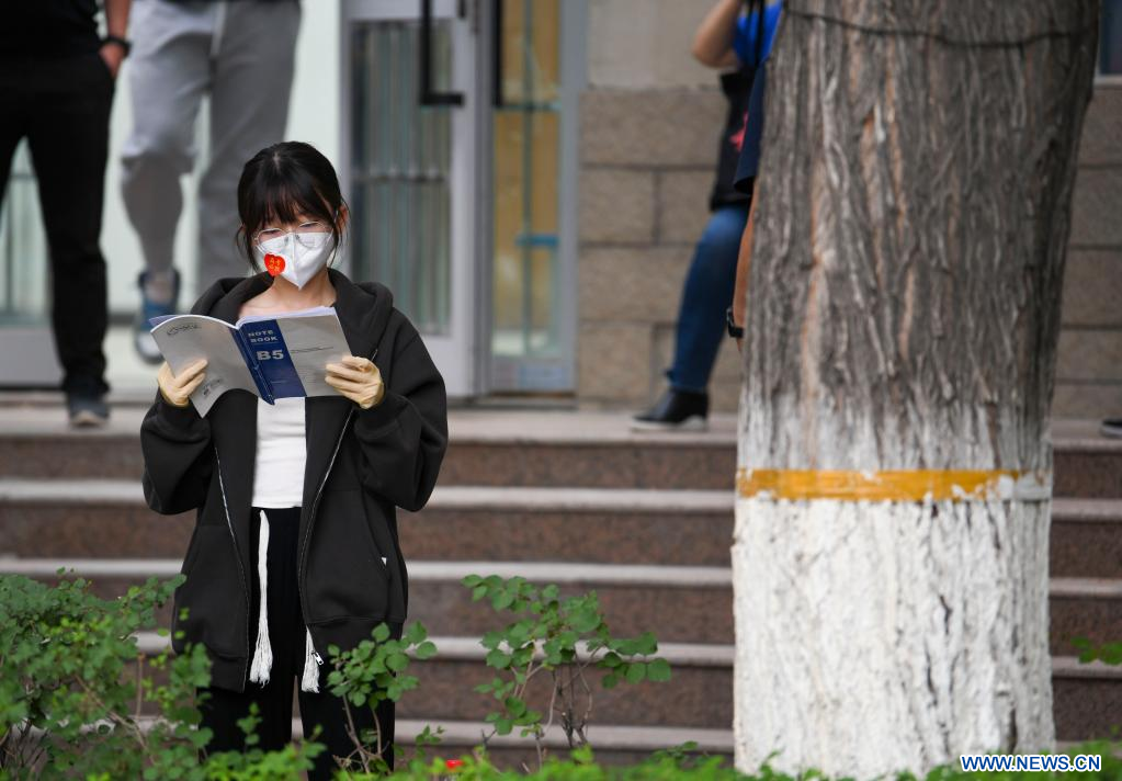 URUMQI, 7 juin (Xinhua) -- Une candidate révise avant le concours dans un site de concours à Urumqi, dans la région autonome ouïgoure du Xinjiang (nord-ouest), le 7 juin 2022. Le concours national d'entrée à l'université de la Chine, aussi connu sous le nom de Gaokao, a commencé mardi cette année. (Photo : Zhao Ge)