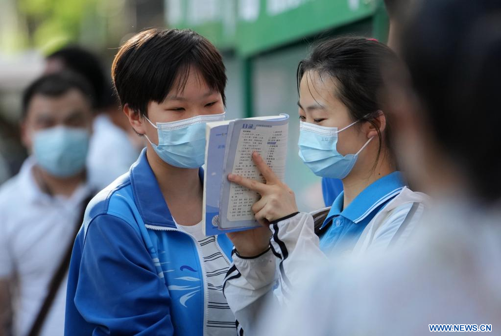 XI'AN, 7 juin (Xinhua) -- Des candidates révisent avant le concours dans un site de concours à Xi'an, dans la provine du Shaanxi (nord-ouest), le 7 juin 2022. Le concours national d'entrée à l'université de la Chine, aussi connu sous le nom de Gaokao, a commencé mardi cette année. (Photo : Li Yibo)