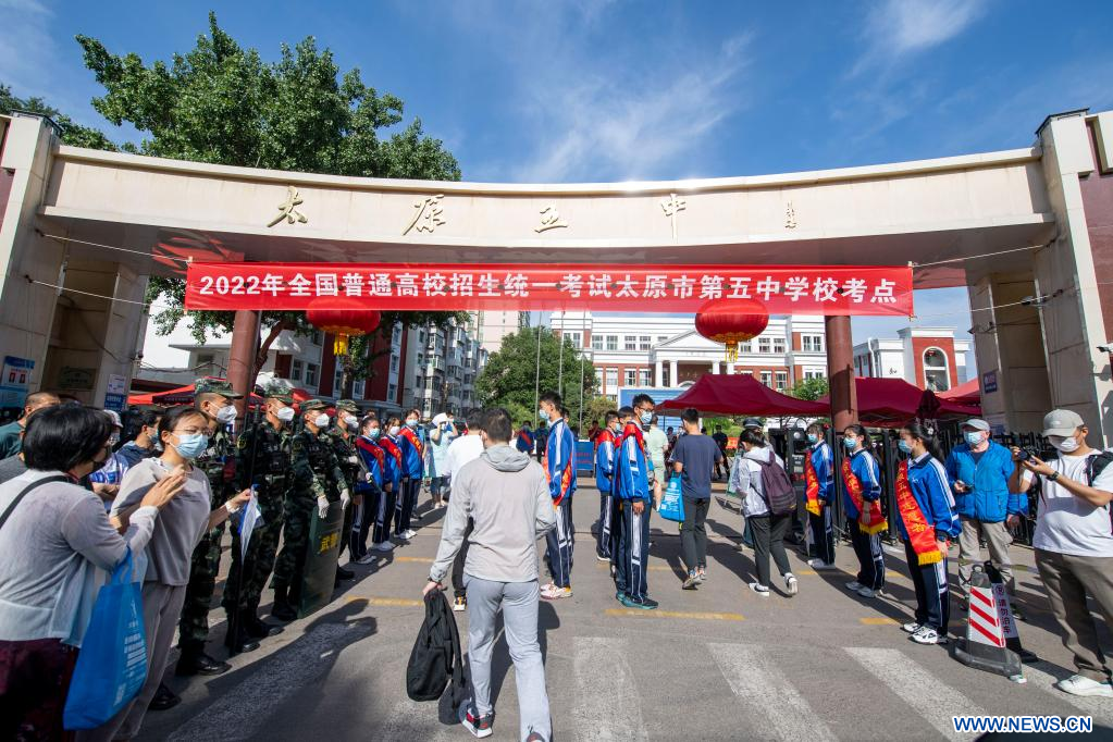 TAIYUAN, 7 juin (Xinhua) -- Des candidats entrent dans un site de concours à Taiyuan, dans la province septentrionale du Shanxi, le 7 juin 2022. Le concours national d'entrée à l'université de la Chine, aussi connu sous le nom de Gaokao, a commencé mardi cette année. (Photo : Yang Chenguang)