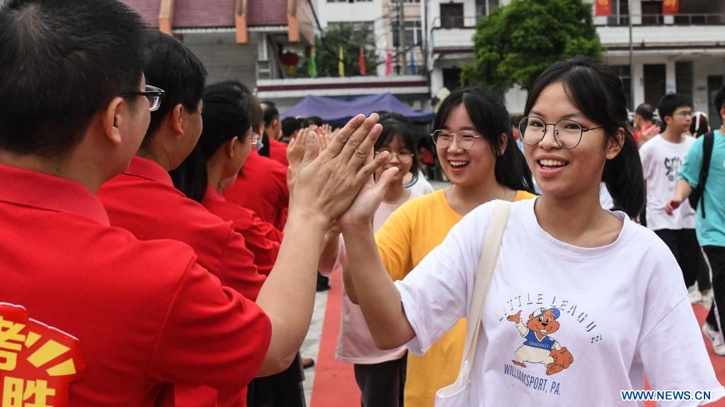 DAHUA, 7 juin (Xinhua) -- Des candidats et leurs professeurs se tapent les mains avant le concours dans le district autonome Yao de Dahua, dans la région autonome Zhuang du Guangxi (sud), le 7 juin 2022. Le concours national d'entrée à l'université de la Chine, aussi connu sous le nom de Gaokao, a commencé mardi cette année. (Photo : Zhang Ailin)
