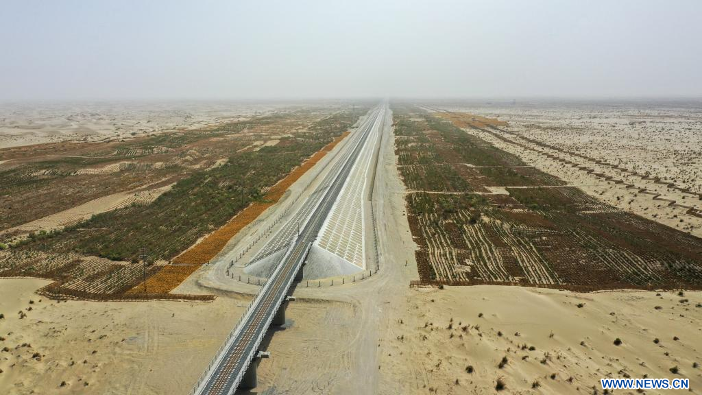 URUMQI, 16 juin (Xinhua) -- La dernière section d'une boucle ferroviaire de 2.712 kilomètres autour du plus grand désert de la Chine, le Taklamakan, dans la région autonome ouïgoure du Xinjiang dans le extrême nord-ouest du pays, a été mise en service jeudi.
