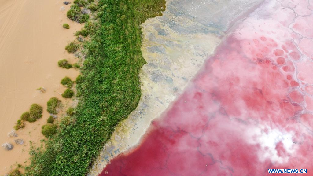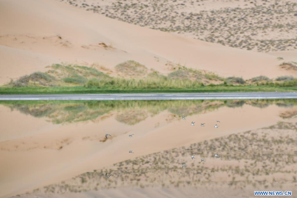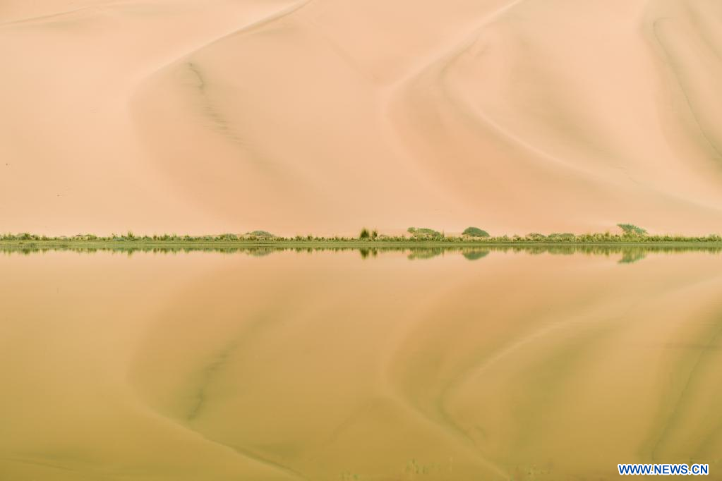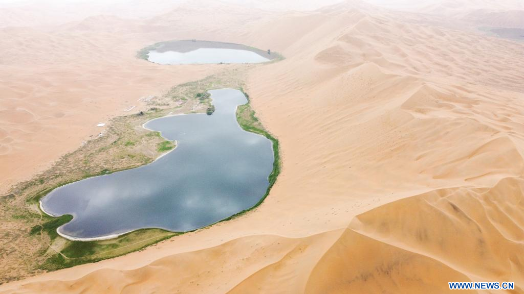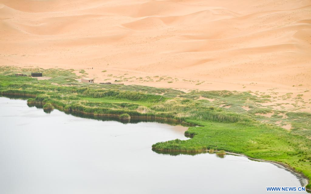 Vue d'un lac dans le désert de Badain Jaran dans la région autonome de Mongolie intérieure (nord de la Chine), le 13 juillet 2022. (Xinhua/Bei He)