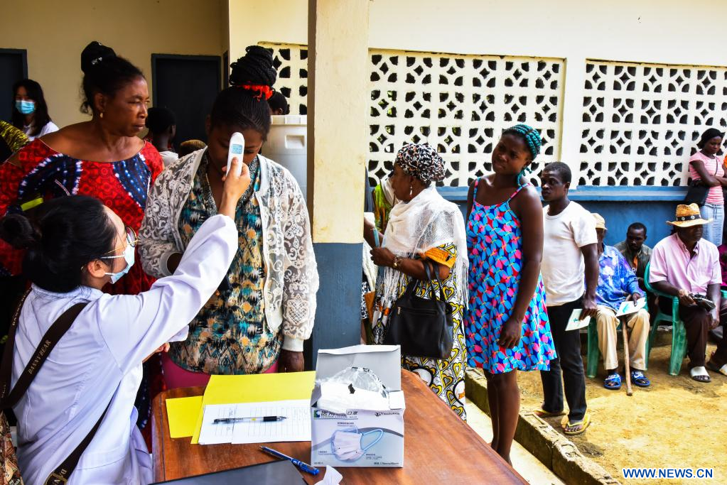 NGAT-BANE, 21 août (Xinhua) -- Une femme médecin chinoise mesure la température corporelle d'une patiente à Ngat-Bane, un village dans la région camerounaise du Centre, le 20 août 2022. Une équipe médicale chinoise a organisé samedi une campagne de consultation et traitement gratuits à destination des habitants de Ngat-Bane. (Xinhua/Kepseu)
