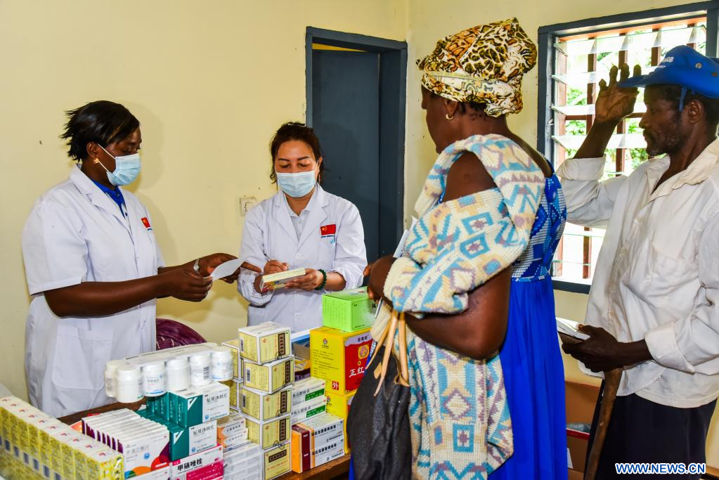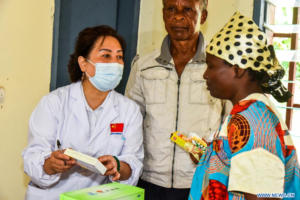 NGAT-BANE, 21 août (Xinhua) -- Une pharmacienne chinoise distribue gratuitement des médicaments à une patiente qui vient de bénéficier d'une consultation à Ngat-Bane, un village dans la région camerounaise du Centre, le 20 août 2022. Une équipe médicale chinoise a organisé samedi une campagne de consultation et traitement gratuits à destination des habitants de Ngat-Bane. (Xinhua/Kepseu)