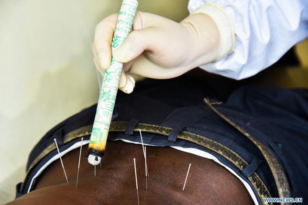 NGAT-BANE, 21 août (Xinhua) -- Un patient reçoit un traitement d'acupuncture traditionnelle chinoise à Ngat-Bane, un village dans la région camerounaise du Centre, le 20 août 2022. Une équipe médicale chinoise a organisé samedi une campagne de consultation et traitement gratuits à destination des habitants de Ngat-Bane. (Xinhua/Kepseu)
