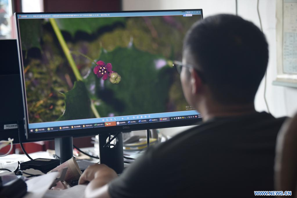 CHENGDU, 23 août (Xinhua) -- Photo prise le 17 août 2022 montre le chercheur Hu Jun vérifiant une photo de l'Euonymus aquifolium à l'Institut de biologie de Chengdu relevant de l'Académie chinoise des Sciences dans la province du Sichuan dans le sud-ouest de la Chine. Selon l'Institut de biologie de Chengdu relevant de l'Académie chinoise des sciences, des chercheurs ont redécouvert en août 2021 une espèce végétale en danger critique d'extinction, Euonymus aquifolium, lors de la deuxième expédition scientifique chinoise sur le plateau Qinghai-Tibet. (Photo : Liu Kun)