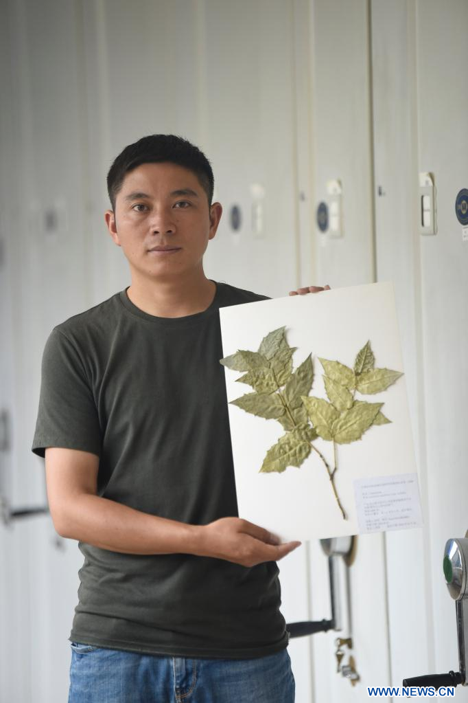 CHENGDU, 23 août (Xinhua) -- Le chercheur Hu Jun montrant un spécimen d'Euonymus aquifolium à l'Institut de biologie de Chengdu relevant de l'Académie chinoise des Sciences dans la province du Sichuan dans le sud-ouest de la Chine, le 17 août 2022. Selon l'Institut de biologie de Chengdu relevant de l'Académie chinoise des sciences, des chercheurs ont redécouvert en août 2021 une espèce végétale en danger critique d'extinction, Euonymus aquifolium, lors de la deuxième expédition scientifique chinoise sur le plateau Qinghai-Tibet. (Photo : Liu Kun)