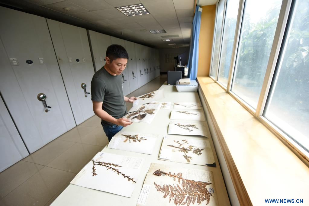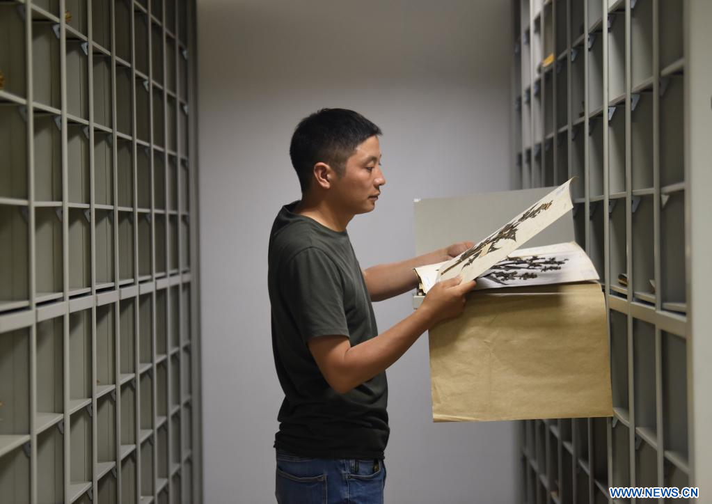 CHENGDU, 23 août (Xinhua) -- Photo prise le 17 août 2022 montre le chercheur Hu Jun vérifiant des spécimens à l'Institut de biologie de Chengdu relevant de l'Académie chinoise des Sciences dans la province du Sichuan dans le sud-ouest de la Chine. Selon l'Institut de biologie de Chengdu relevant de l'Académie chinoise des sciences, des chercheurs ont redécouvert en août 2021 une espèce végétale en danger critique d'extinction, Euonymus aquifolium, lors de la deuxième expédition scientifique chinoise sur le plateau Qinghai-Tibet. (Photo : Liu Kun)