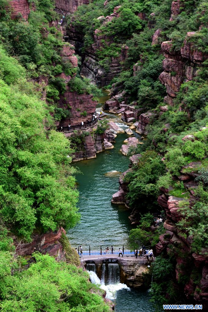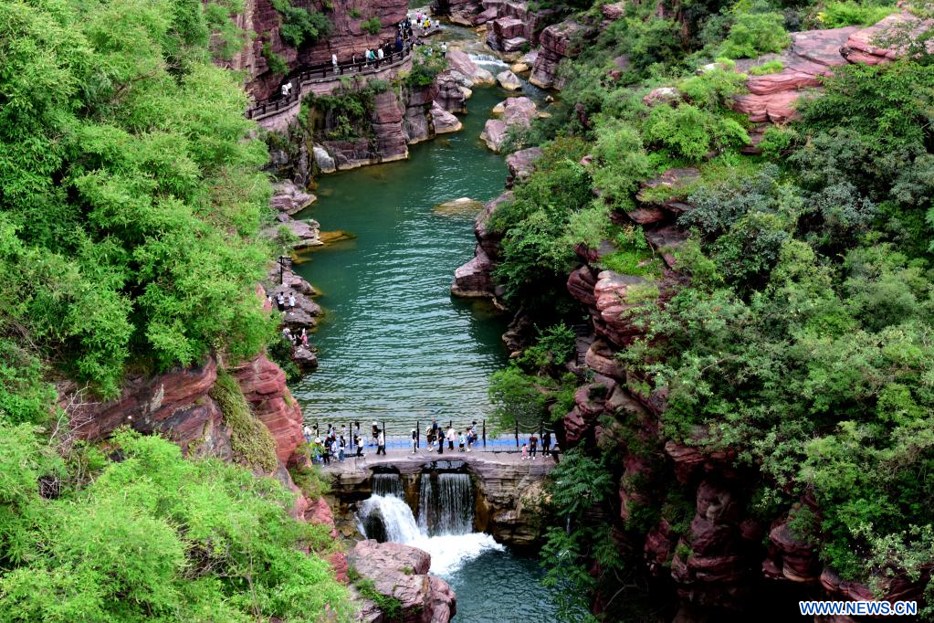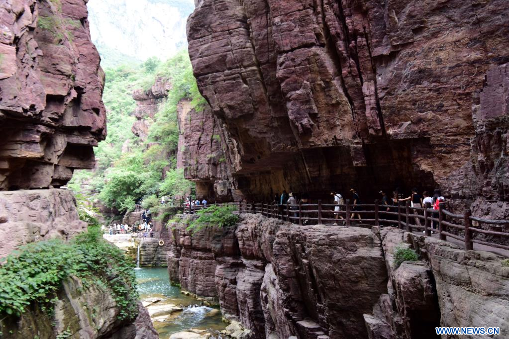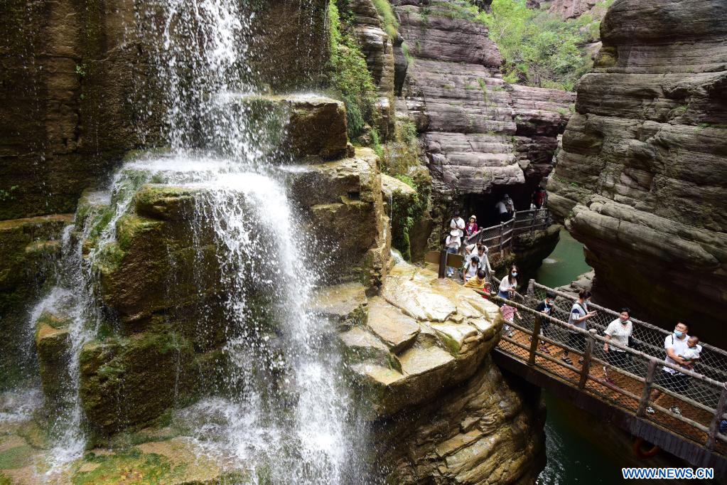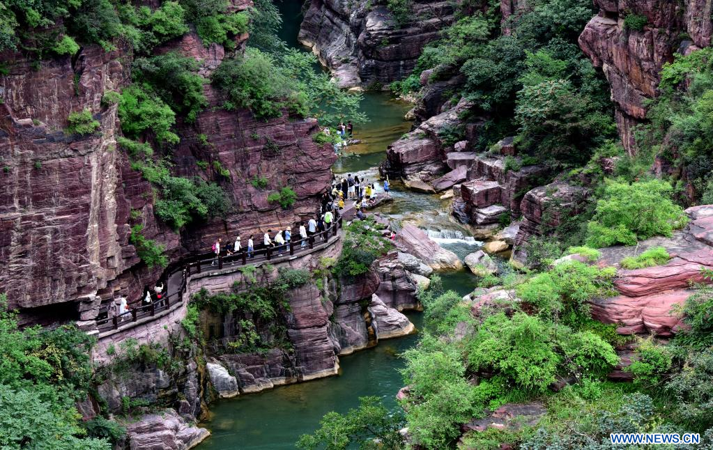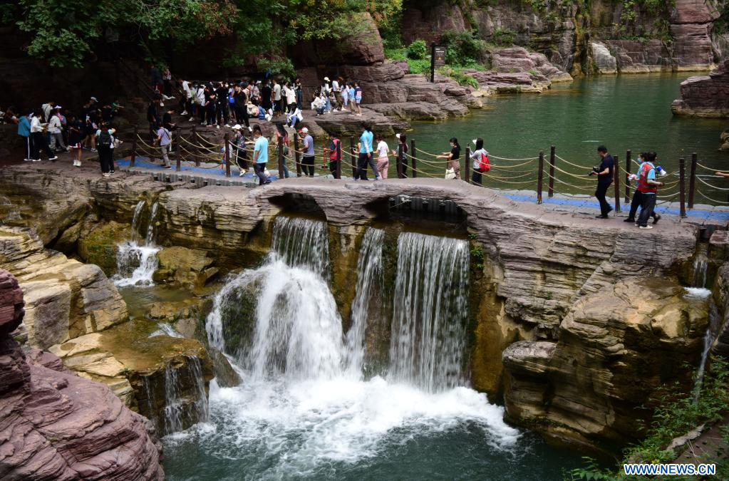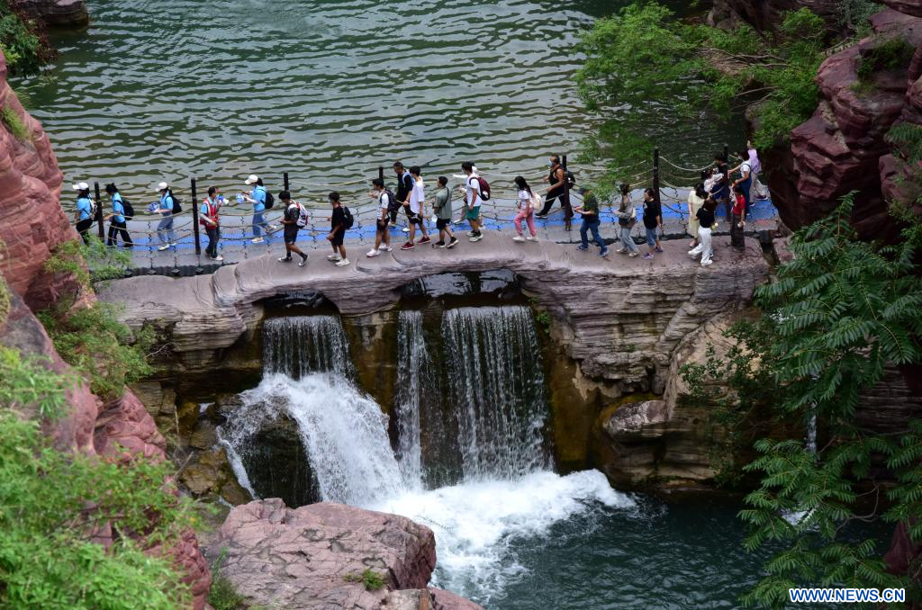 ZHENGZHOU, 25 août (Xinhua) -- Des touristes visitent le site touristique du mont Yuntai, dans la province chinoise du Henan (centre), le 24 août 2022. (Photo : Lyu Guoqing)