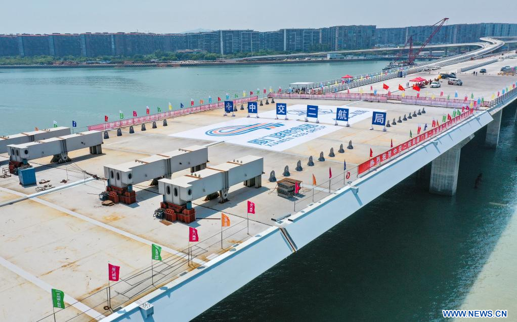XIAMEN, 13 septembre (Xinhua) -- Photo aérienne prise le 12 septembre 2022 du pont de Xiang'an en construction à Xiamen, dans la province chinoise du Fujian (sud-ouest). Le pont d'autoroute de 12 km, dont 4,5 km traversant la mer, a été conçu pour une vitesse de 80 km par heure. (Photo fournie par CCCC Second Harbour Engineering Co., Ltd.)