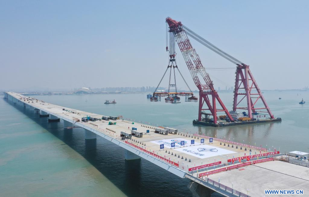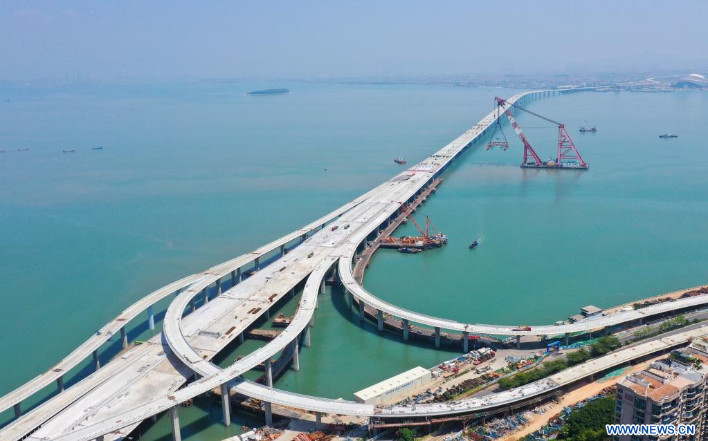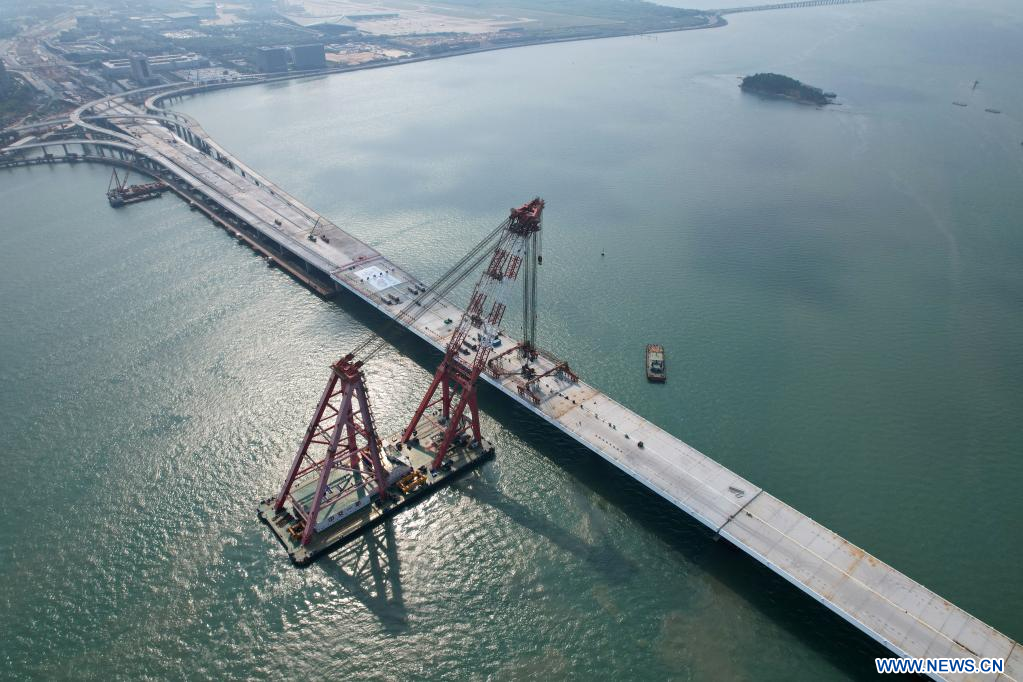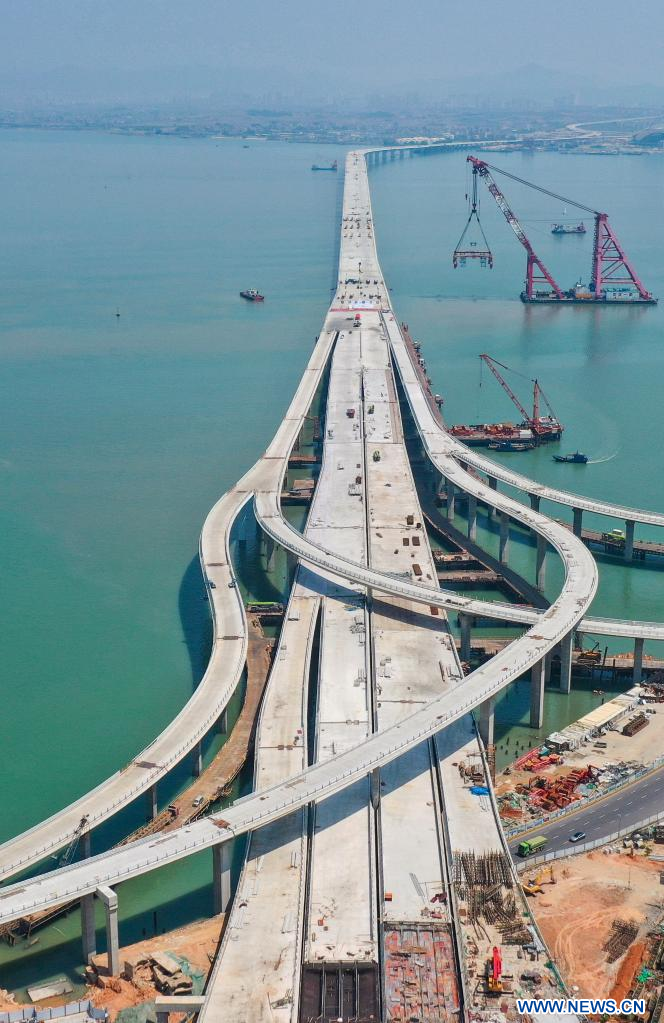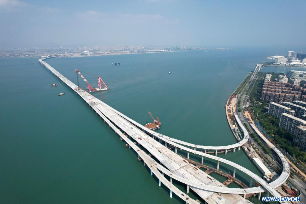 XIAMEN, 13 septembre (Xinhua) -- Photo aérienne prise le 12 septembre 2022 du pont de Xiang'an en construction à Xiamen, dans la province chinoise du Fujian (sud-ouest). Le pont d'autoroute de 12 km, dont 4,5 km traversant la mer, a été conçu pour une vitesse de 80 km par heure. (Photo : Zeng Demeng)