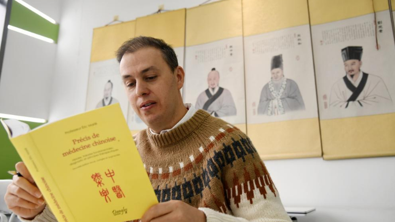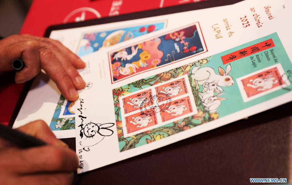 L'artiste chinois, Chen Jianghong, qui a conçu deux blocs de timbres émis par la Poste de France pour cérébrer le Nouvel An lunaire chinois, dédicace sa création de timbres consacrés à "l'année du Lapin", lors d'une cérémonie organisée à Paris, en France, le 14 janvier 2023. Cette année, la Poste de France célèbre le Nouvel An du calendrier lunaire chinois avec l'édition de deux blocs de cinq timbres consacrés à "l'année du Lapin". (Xinhua/Gao Jing)