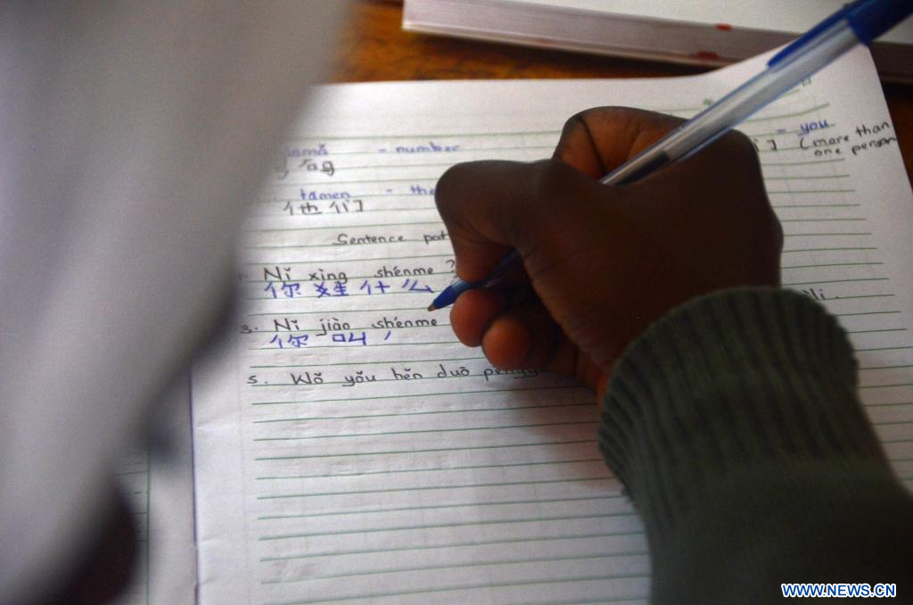 KAMPALA, 21 février (Xinhua) -- Un étudiant écrit des caractères chinois au lycée musulman Kawempe à Kampala en Ouganda, le 20 février 2023. Plus de 600 étudiants ont repris lundi les cours de chinois dans les écoles secondaires après deux mois de vacances à Kampala. (Xinhua/Nicholas Kajoba)